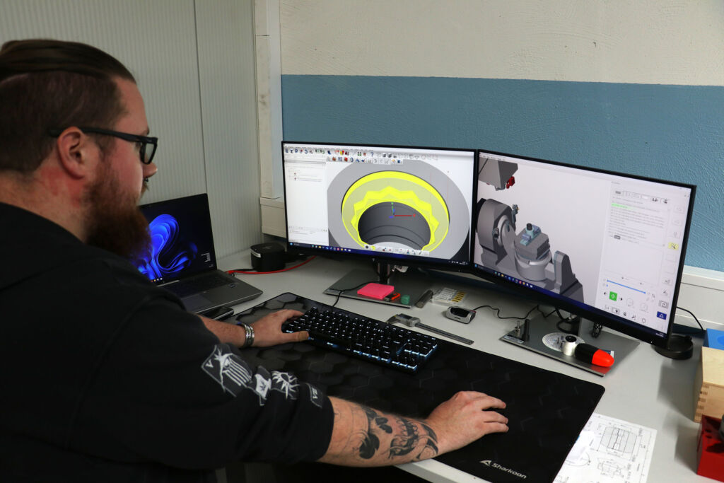 Ein wichtiger Schritt für die Sicherheit und Effizienz bei der komplexen 5-Achs-Bearbeitung war die Einführung von Hypermill Virtual Machining. Die NC-Code-Simulation auf Basis digitaler Zwillinge sorgt dafür, dass der erzeugte Code vorab auf Kollision und Prozessprobleme geprüft und optimiert wird. Das Optimizer-Modul erkennt gefährliche Situationen während der NC-Code-Generierung und passt die Fräsbahnen vollautomatisch an, sodass etwa unnötige Rückzüge auf Sicherheitsebenen entfallen und der Bearbeitungsprozess beschleunigt wird.