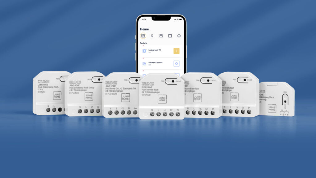 Sieben kompakte Unterputzmodule smartifizieren Licht, Temperatur und Beschattung. Vernetzt und gesteuert werden die Jung Home Pucks lokal über die kostenfreie App des Smart-Home-Systems. Die Pucks eignen sich besonders zur Nachrüstung unter vorhandenen Abdeckungen. Sie können ohne Umbauten installiert werden, sie verschwinden unsichtbar in den Gerätedosen unter Bedienelementen und Steckdosen, ohne Stemmarbeiten, ohne Server und unabhängig vom Internet. Neben Steuerung dient die zugehörige App auch dazu, die Pucks miteinander zu vernetzen. So entsteht ein budgetfreundliches, vollständig lokales und flexibel erweiterbares Smart Home.