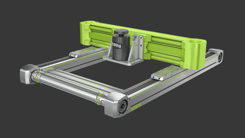 Mit einer Nutzlast von bis zu 350kg und einer zehnfach höheren Torsionssteifigkeit lassen sich mit den Brückenachsen HB von Hiwin auch größere Lasten dynamisch über weite Strecken freitragend bewegen. Das Aluminium-Stranggussprofil des biege- und torsionssteifen Linearmoduls ist in sich geschlossen und mit Aussteifungen versehen. Die Schwerlastachsen sind mit Zahnriemen-, Linearmotor- sowie Zahnstangenantrieben kombinierbar. Die Linearmodule sind mit einem in mm-Schritten frei wählbaren Hub auf eine Gesamtlänge von bis zu 5m, mit Endschalter oder Encodersystem konfigurierbar.