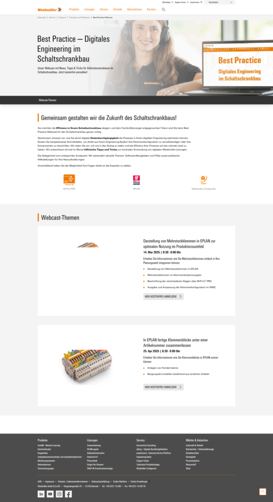 Die zunehmende Digitalisierung stellt Unternehmen im Schaltschrankbau vor neue Herausforderungen. Um den steigenden Anforderungen an Effizienz und Fachkräftemangel entgegenzuwirken, sind besondere Lösungen gefragt. Der Weidmüller-Webcast bietet Elektrokonstrukteuren praxisnahe Einblicke und konkrete Beispiele, die sich direkt im Arbeitsalltag umsetzen lassen. Er findet jeden Monat statt und stellt reale Anwendungsfälle für die Klemmleisten- und Gehäusekonfiguration, sowie das Markieren der Komponenten aus der Praxis vor. Die Teilnehmerinnen und Teilnehmer erhalten wertvolle Einblicke, wie digitale Datendurchgängigkeit die Prozesse im digitalen Engineering verbessern kann.