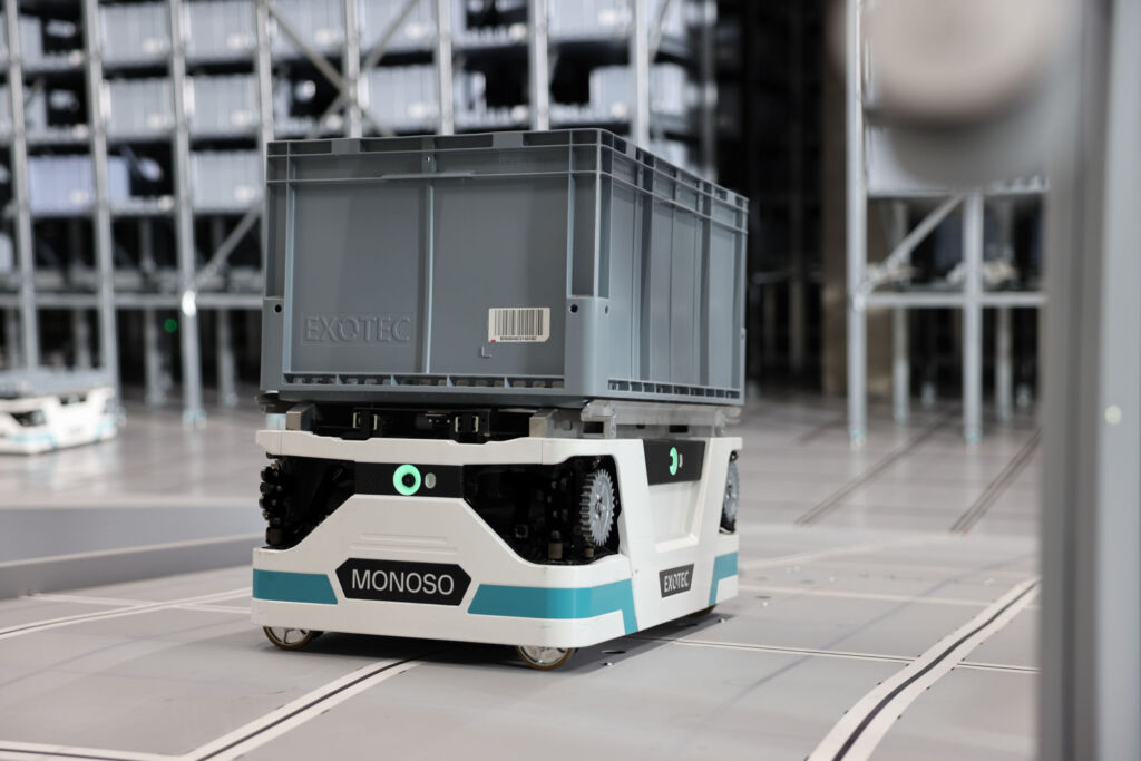 Das Schlüsselelement ist und bleibt der Skypod-Lagerroboter, der ein kleines Facelift bekommen hat. Die Roboter sind nun kompakter konzipiert, sodass sie nebeneinander die Regale hochklettern können. Im Gegenzug ist das System insgesamt gewachsen: Auf eine Höhe bis zu 14 Metern. Nicht nur die Höhe betreffend gibt es neue Fähigkeiten für die autonomen Roboter. Auch am Boden glänzen sie mit neuen Eigenschaften. So kosten die Roboter die verfügbare Bodenfläche nun vollständig aus, indem sie den Raum unter den Regalen zur Fortbewegung bei einer Geschwindigkeit von bis zu vier Metern pro Sekunde nutzen. Mit Blick auf die Fortbewegung ist Exotec in der neuen Ausbaustufe auf kamerabasierte Positionsbestimmung übergegangen.