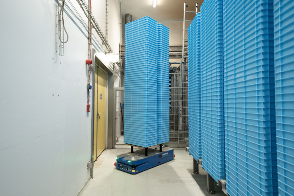 Aus diesem Grund entschied sich Gustavo Gusto, den Transport und die Einlagerung der Teigrohlinge mithilfe von FTS-Lösungen zu automatisieren. Dabei sollten die aufgestapelten Kisten mit den Teiglingen aus der Anlage entnommen, im Lager eingelagert und nach der Ruhezeit wieder in die Produktion zurücktransportiert werden. Nach einer intensiven Recherche kam 2021 der Kontakt zu Bär Automation.