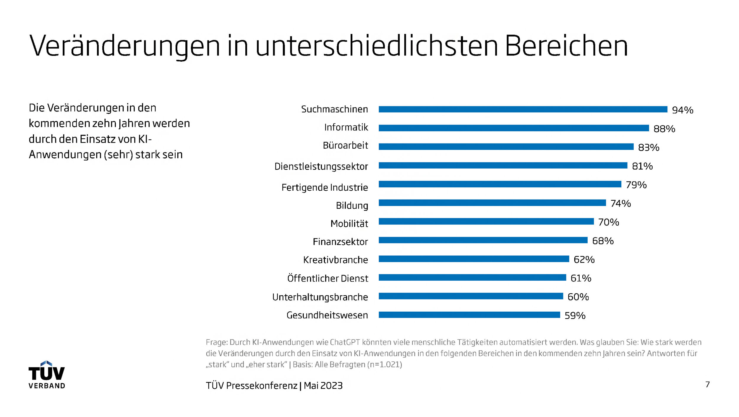 Laut einer Umfrage des TÜV-Verbands sorgt sich die Bevölkerung vor unkalkulierbaren Risiken, Fake-News-Schwemmen und Arbeitsplatzverlusten im Zusammenhang mit generativer künstlicher Intelligenz.