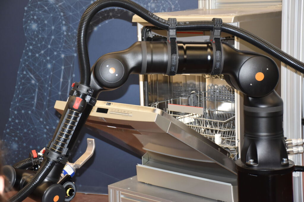 Das Robotermodell KR1018 von Kassow Robots ermöglicht als Siebenachser eine besonders hohe Beweglichkeit bei kleinem Footprint. Denn die Bewegungen des Leichtbauroboters kommen denen eines menschlichen Arms näher als herkömmliche Sechsachser. Die siebte Achse spielt bei der BSH-Lösung eine entscheidende Rolle: „Der Prüfstand ist sehr eng und kompakt konzipiert, gleichzeitig wird aber ein seitliches Greifen verlangt. Nur die siebte Achse des Cobots erlaubt dem Roboterarm, ums Eck zu greifen“, betont Dennis Burk, Mitglied der Geschäftsleitung bei Heldele Automation. „Auch wiederkehrende Fotoaufnahmen im Inneren der Geschirrspüler sind dadurch möglich.“ Fotografiert werden durch eine am Roboterarm montierte Kamera ein vorher definierten Bereich, um die Ergebnisse der Erprobungen zu dokumentieren.