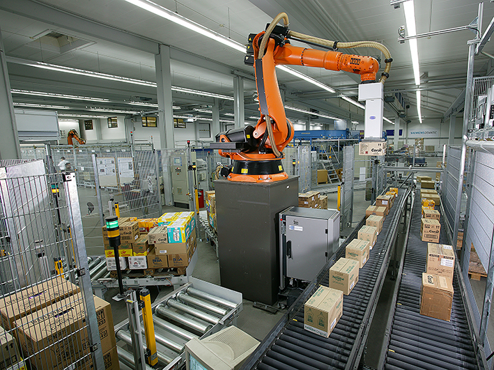Neben der Produktions- und Verpackungstechnik gewinnt auch die innerbetriebliche Logistik zunehmend an Bedeutung. Automatisierte Transportlösungen und mobile Robotersysteme ermöglichen es, Rohstoffe, Verpackungsmaterialien und fertige Produkte effizient zwischen Produktionsbereichen, Lager und Versand zu bewegen. Kuka kombiniert daher leistungsfähige Industrieroboter mit Greifertechnologie, intelligenter Software und autonomen mobilen Robotern, um vollständig automatisierte Palettierprozesse zu realisieren. Die Systeme sind darauf ausgelegt, einen nahtlosen Materialfluss zwischen Produktion, Verpackung und Lagerlogistik zu ermöglichen. Durch die digitale Vernetzung der einzelnen Komponenten lassen sich Palettenbewegungen, Fördertechnik und Robotersteuerung effizient miteinander koordinieren.