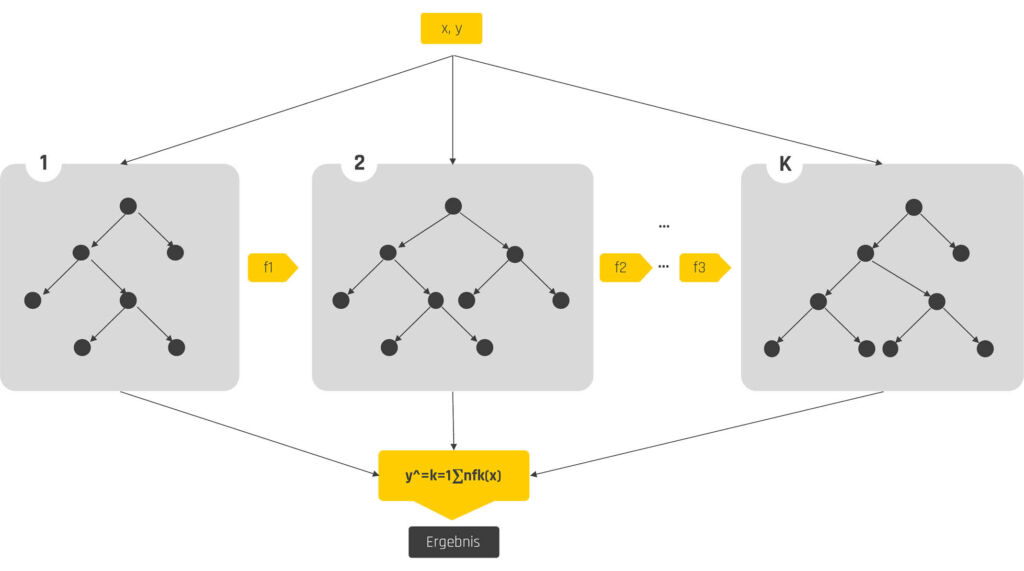 Viele Firmen wünschen stattdessen eine gleichbleibend gute und verlässliche Prognose, die Planende unterstützt und dabei weitere geschäftsprägende Einflussfaktoren berücksichtigt. Künstliche Intelligenz (KI) und Machine Learning (ML) bieten in dieser Hinsicht vielversprechende Optionen. Diese Verfahren setzen auf Lernfähigkeit und vermögen es, Erfahrungen zu konservieren und das Wissen aus vergangenen Fällen auf aktuelle Aufgaben anzuwenden. Die KI-Derivate und -Methoden sind vielfältig und hier gleichwohl kaum umfassend zu reflektieren. Daher möchte sich der Autor auf die dynamische Prognose mit den Gradient-Boosting-Verfahren und insbesondere das XGBoost-Verfahren konzentrieren. Der XGBoost-Ansatz (Bild 1) setzt auf Entscheidungsbäume, die schrittweise den verbleibenden Fehler beim Lernen durch eine weitere Vorhersage lindern. Boosting Verfahren schärfen sich im Lernprozess anhand der Trainingsdaten, bevor die Prognose durchgeführt wird. Diese Methoden arbeiten mit mehreren Variablen und Zeitreihen, die in die Modell-Erstellung einfließen, und können deren Wertbeitrag zum Ergebnis transparent darlegen. Dieses Verfahren besitzt zudem einige weitere herausragende Eigenschaften wie etwa sehr hohe Ergebnisgüte und gute Performance. Zudem ist XGBoost ist den meisten Data-Science-Umgebungen, wie Python oder R, enthalten, was die kostengünstige Verwendung erlaubt.
