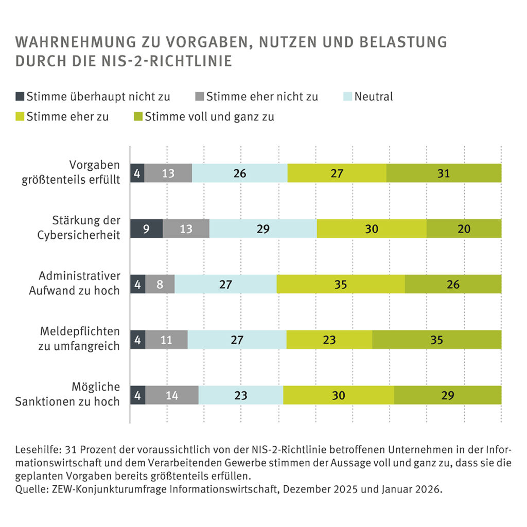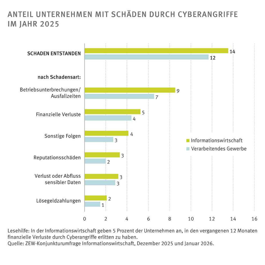 Etwa jedes siebte Unternehmen in der Informationswirtschaft und jedes achte Unternehmen im verarbeitenden Gewerbe hat im vergangenen Jahr Schäden durch Cyberangriffe erlitten. Das geht aus einer repräsentativen Befragung des ZEW Mannheim hervor, an der sich im Dezember 2025 und Januar 2026 rund 1.100 Unternehmen beteiligten. Die EU-Richtlinie zur Netz- und Informationssicherheit NIS-2 soll zu mehr Cybersicherheit beitragen. Deren Umsetzung wird aber von einem Großteil der von der neuen Regelung betroffenen Unternehmen in Deutschland kritisch bewertet.