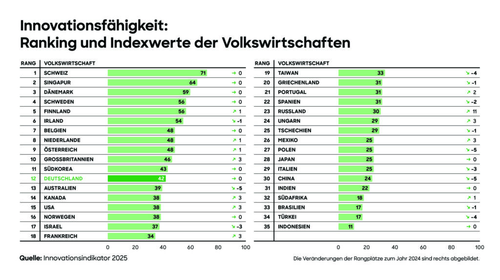 Der Innovationsindikator, den der Bundesverband der Deutschen Industrie (BDI) und die Unternehmensberatung Roland Berger auf dem InnoNation Festival in Berlin vorstellten, analysiert seit 2005 die Innovationsfähigkeit wichtiger Volkswirtschaften. Das Innovationsranking, das BDI und Roland Berger mit dem Fraunhofer ISI und dem ZEW – Leibniz-Zentrum für Europäische Wirtschaftsforschung erstellt haben, führen erneut kleinere, hochspezialisierte Nationen an: die Schweiz (Rang 1), Singapur (Rang 2) und Dänemark (Rang 3).